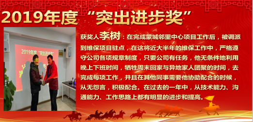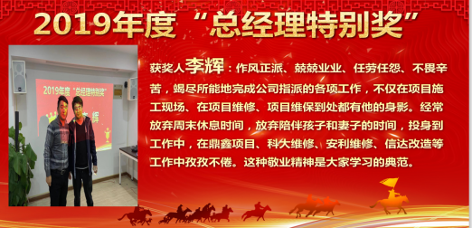 迎新春年会在刘涛总经理热情洋溢的新年贺词中拉开了序幕,他说:“刚刚过去的一年,在全体同仁共同努力下,圆满完成了鼎鑫金融中心、蒙城邻里中心、岗集金湖花园等消防施工项目,同时完成了天门湖厂房、信达水岸名都、中科大先研院气体灭火、京翰教育夏店路校区、学田教育、招商大厦全季酒店、科大讯飞A5员工活动中心、富芯微氢气站、化学品库等消防改造项目。投标项目达到30多项,取得了消防设施工程专业承包壹级资质,以及消防安全评估正式贰级资质……。新的一年,我们将实行目标管理,从“过程管理”逐渐向“结果管理”过渡,更加强调以结果导向,更加强调部门经理利益与责任的良好匹配;营收目标完成率将和我们的绩效工资、奖金挂钩,年终奖金将分散到四个季度发放……让我们只争朝夕,不负韶华,2020年再创辉煌!”