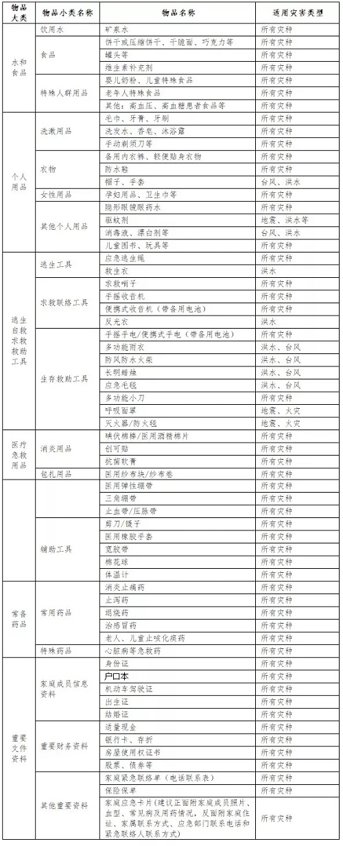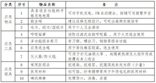 而扩充版内容则包括应急食品、个人防护用品、逃生工具、医疗急救用品和药品、相关信息资料6大类、18小类、60种物资。